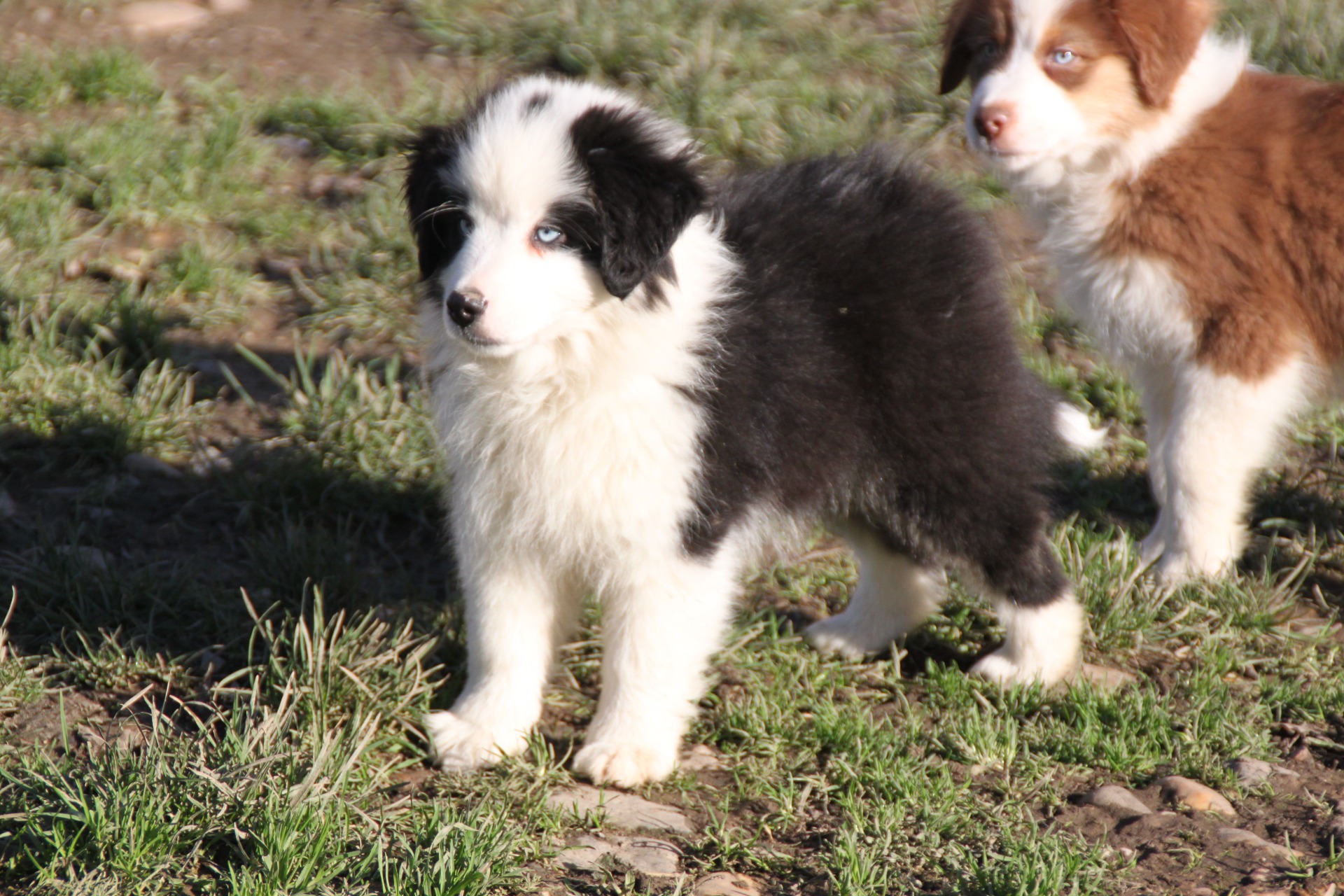 1 mâle bleu merle, 1 rouge merle, 2 rouge tricolore et 1 noir tricolore